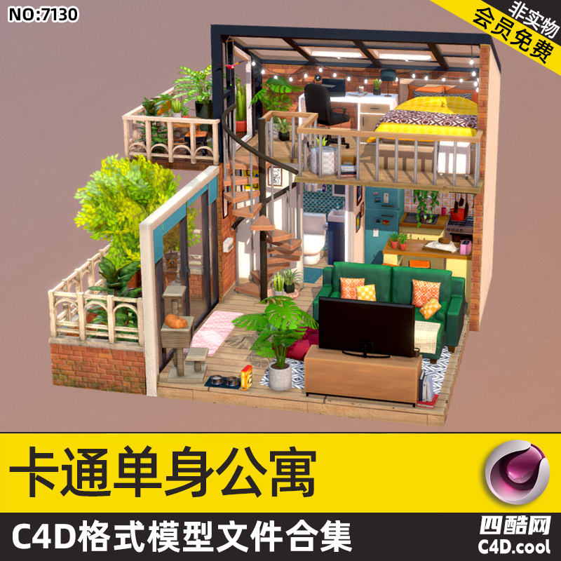 这个 C4D 模型是卡通单身公寓模型,包含的物品(对应模型)有: