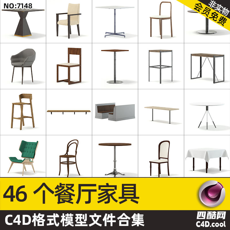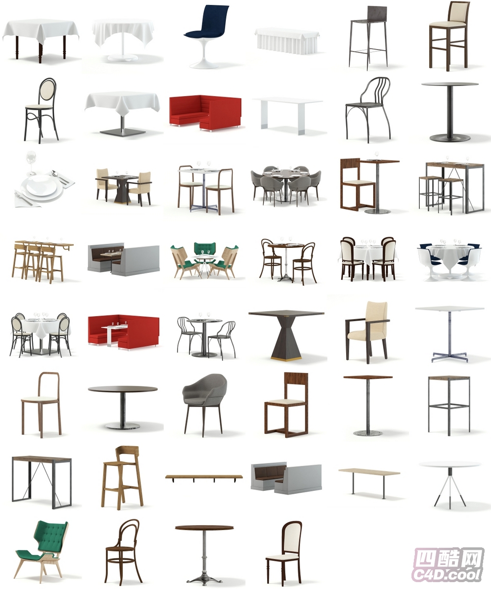 这个 C4D 模型是餐饮类桌椅家具合集,包含的物品(对应模型)有: