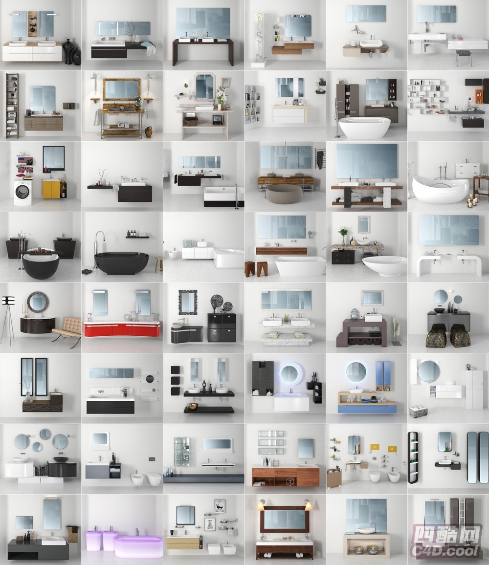 这个 C4D 模型是现代卫浴空间组件合集,包含的物品(对应模型)有: