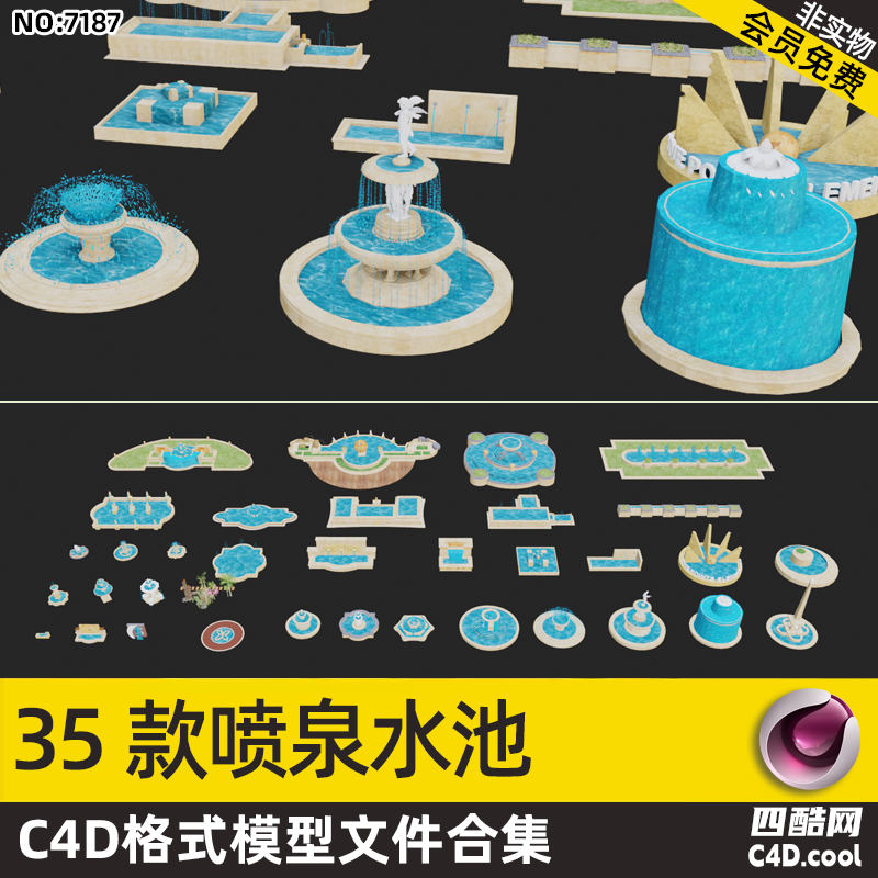 这个 C4D 模型是喷泉水池景观组件合集,包含的物品(对应模型)有: