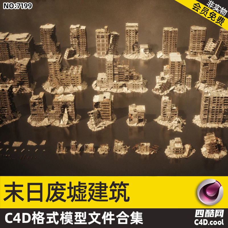 这个 C4D 模型是末日废墟风格建筑模型合集,包含的物品(对应模型)有:多款破损坍塌的高层建筑废墟、小型建筑残垣、废墟场景配套的建筑碎片。