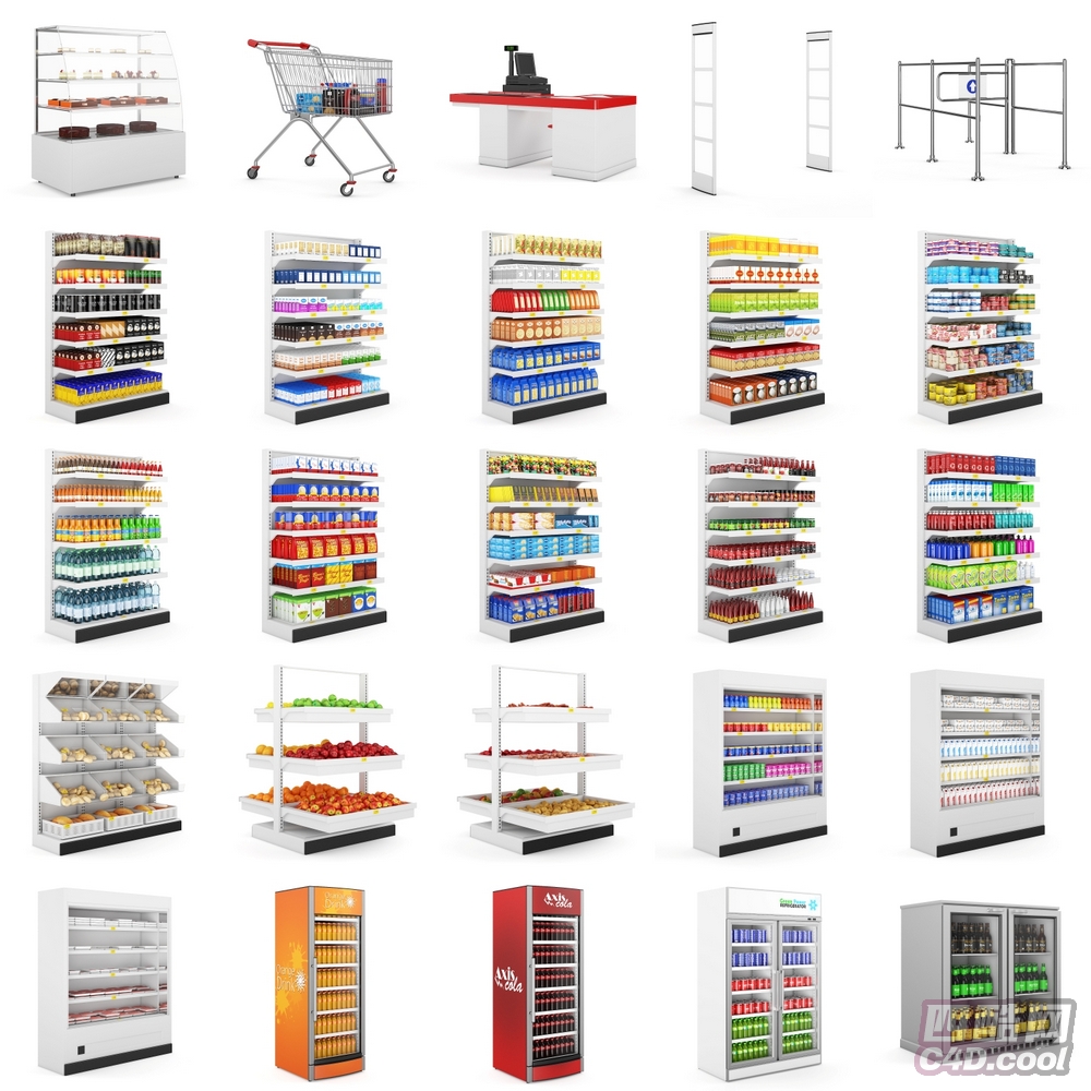 这个 C4D 模型是超市场景设施与商品陈列合集,包含的物品(对应模型)有:
