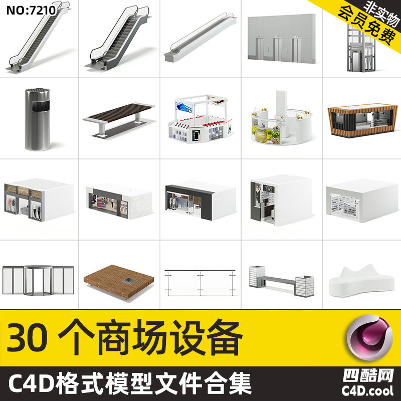 这个 C4D 模型是商业综合体配套设施与微型店铺合集,包含的物品(对应模型)有: