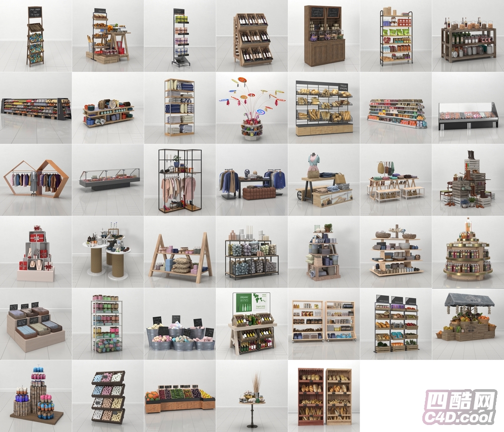 这是零售店铺陈列道具 C4D 模型合集,包含的物品(对应模型)有: