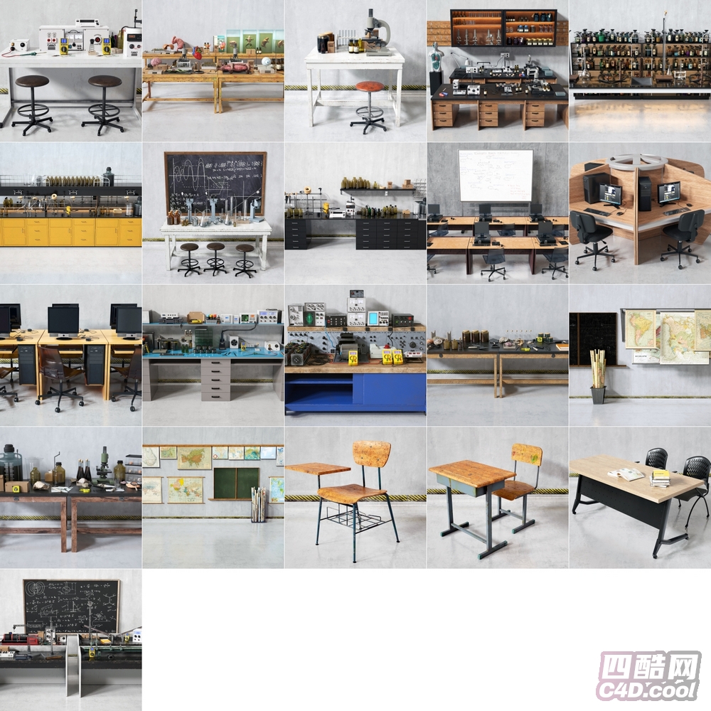 这是实验室与办公场景 C4D 模型合集,包含的物品(对应模型)有: