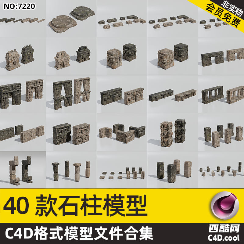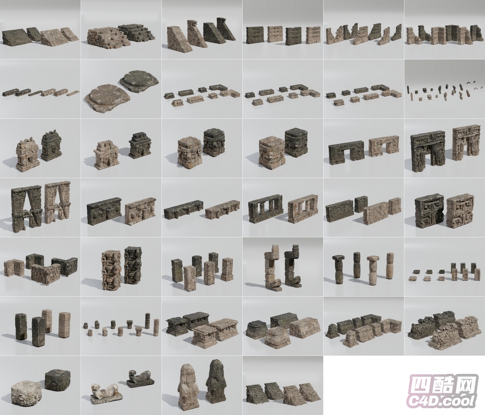 这是古文明遗迹风格建筑组件 C4D 模型合集,包含的物品(对应模型)有: