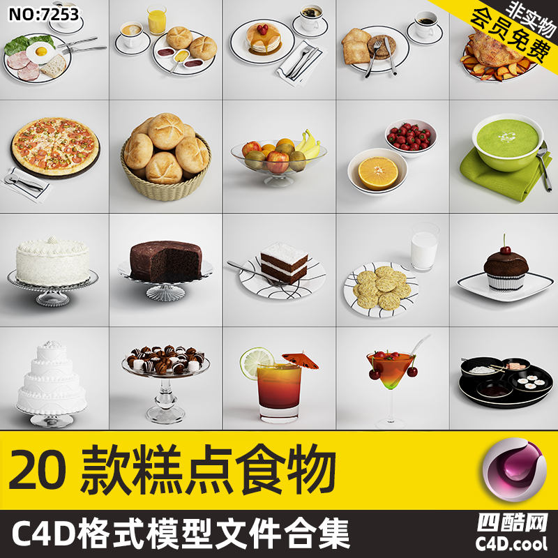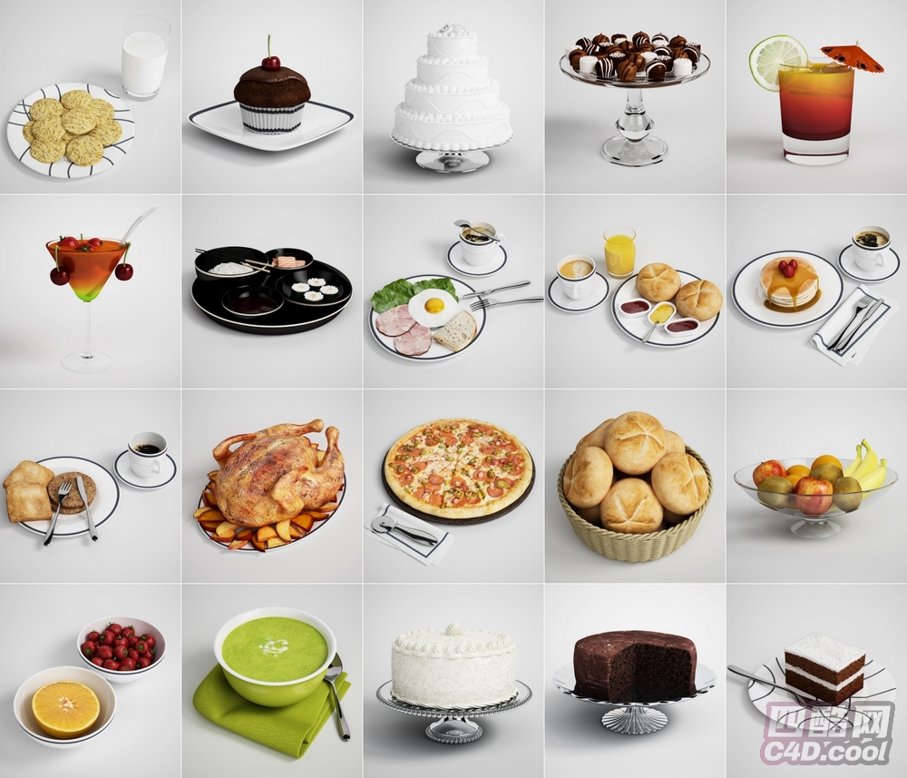 这是美食餐饮类 C4D 模型合集,包含的物品(对应模型)有: