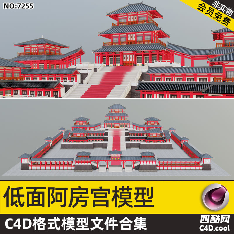 这是低面风格阿房宫 C4D 模型合集,包含的物品(对应模型)有: