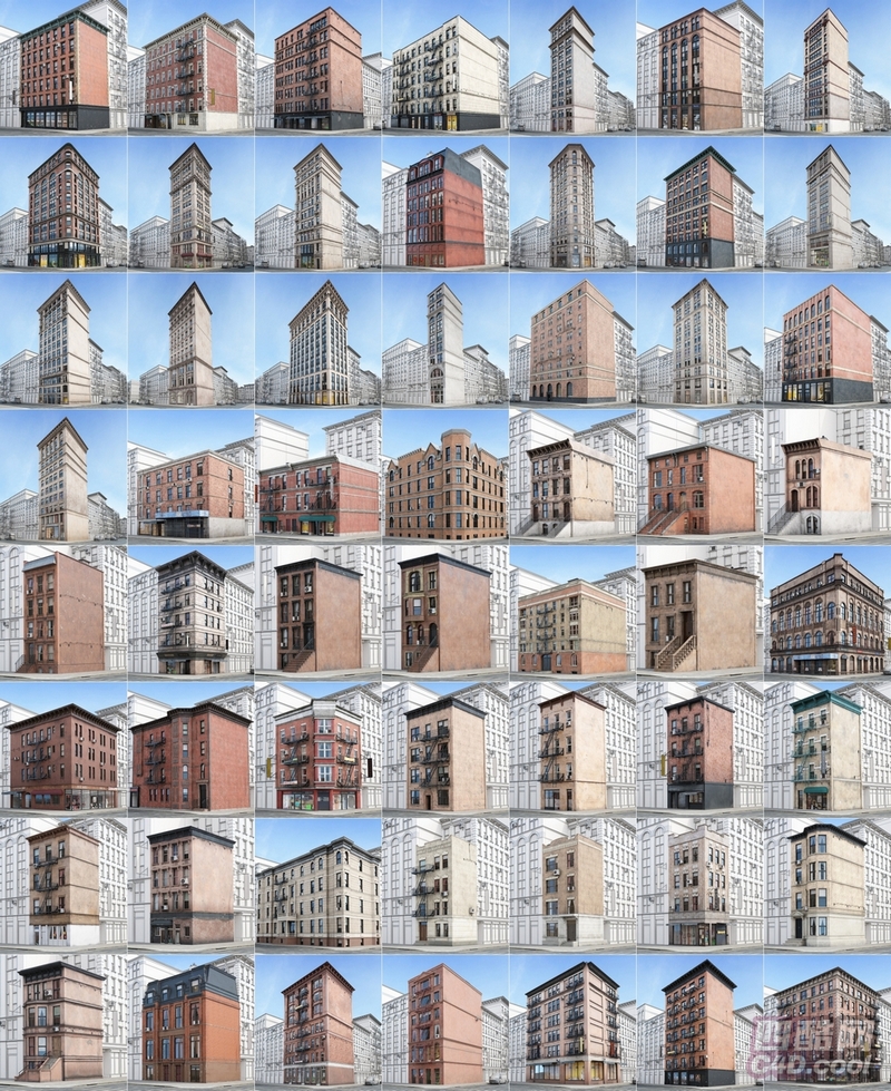 • 样式细节:不同形态(窄高塔式、宽幅联排式、带外楼梯款)、不同年代风格(复古工业风、老式居民楼风)的城市建筑