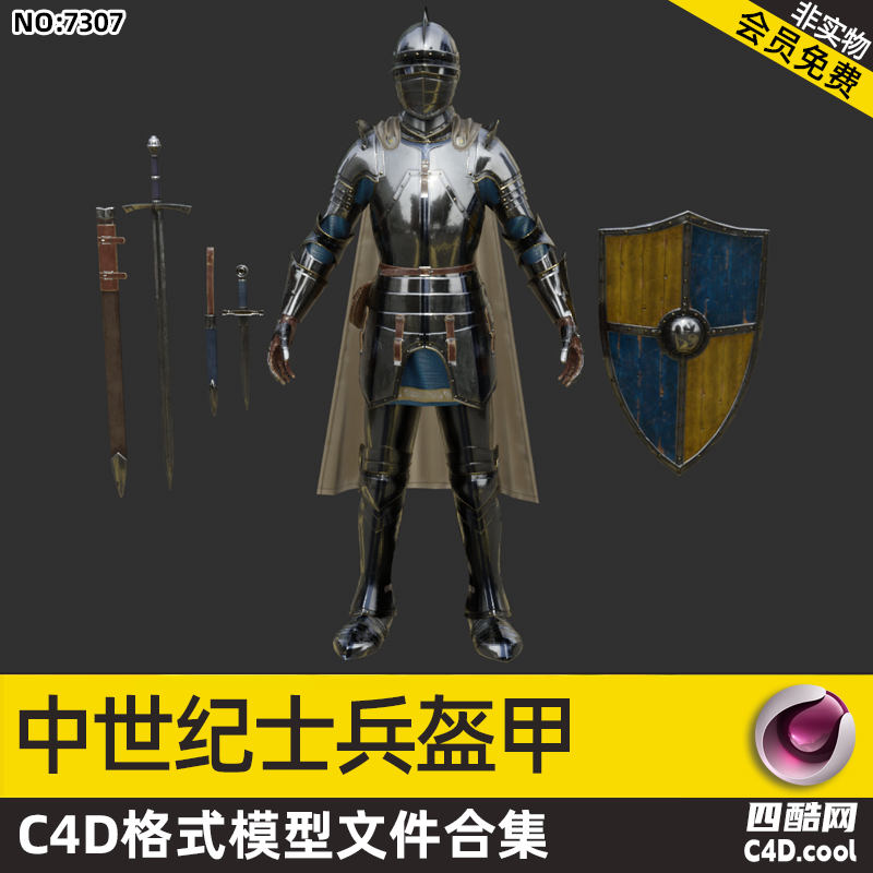 这是中世纪士兵盔甲风格 C4D 模型合集,包含的物品(对应模型)有: