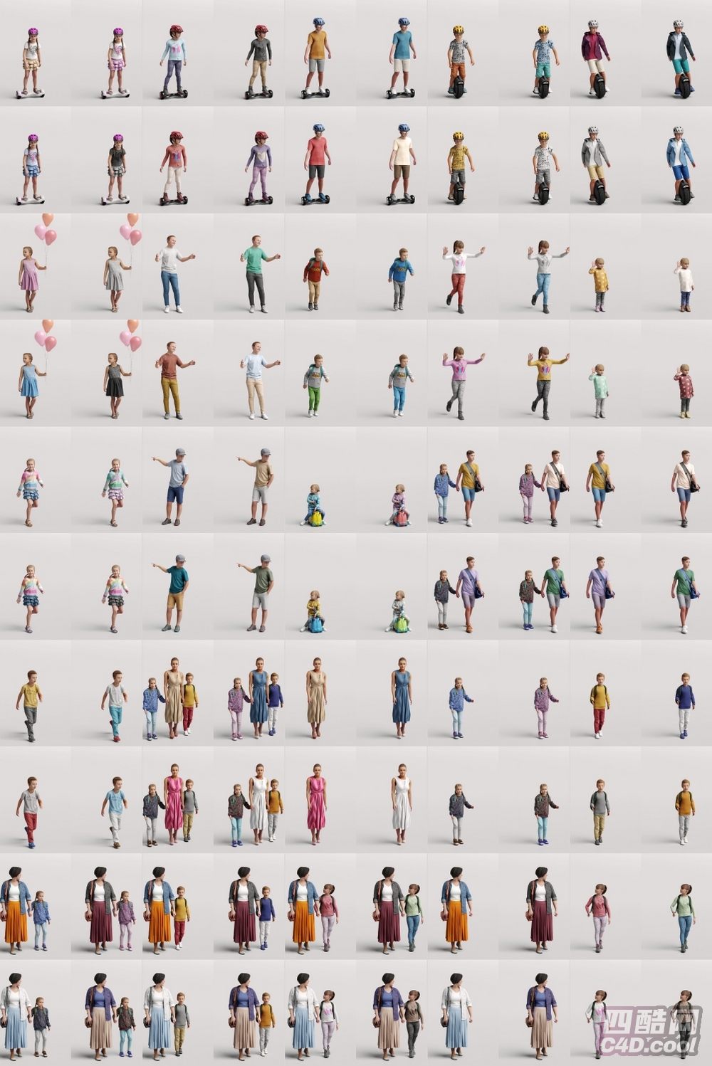 - 儿童角色:骑滑板车的儿童、手持气球的儿童、独立 / 结伴的儿童