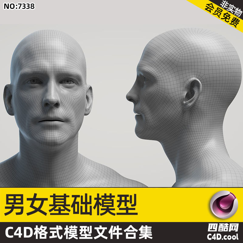 C4D 男女基础人体模型、高精度人头拓扑模型、角色建模基底素材、布线人体模型、数字人基础模型、C4D 人体拓扑素材