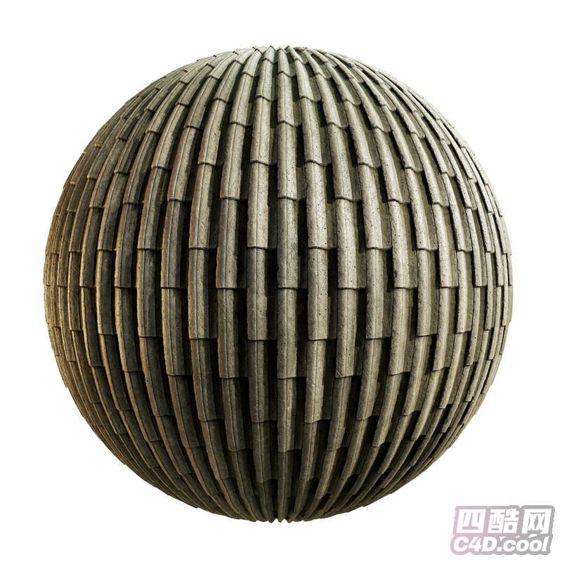 这是一张瓦片 / 石板瓦材质的 3D 纹理贴图,呈现出复古做旧的建筑屋面质感。纹理以纵向条状瓦片为基础,紧密排列并包裹在球体表面,模拟出瓦片在曲面上的自然弯曲与堆叠效果。瓦片颜色为深灰与浅灰相间,带有明显的风化痕迹、磨损边缘和细微色差,质感粗糙且富有层次感,适合用于古建筑、屋顶、墙面等场景的 3D 建模渲染。
