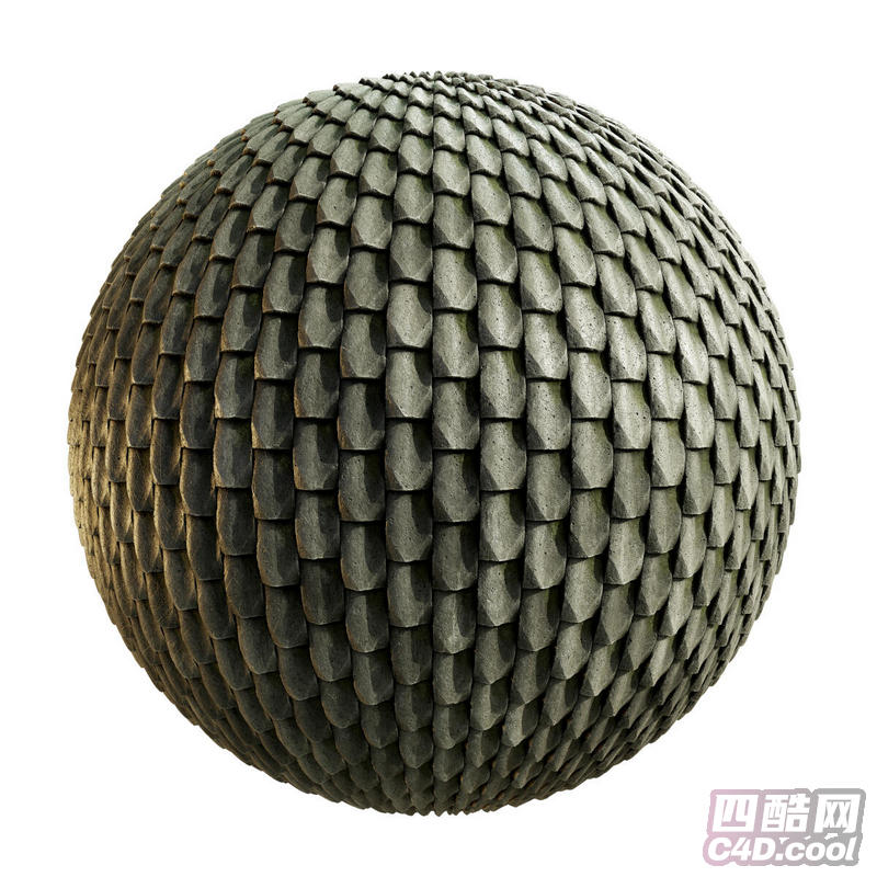这是一套灰色石质亚洲屋顶瓦 3D 纹理贴图,纹理以饱满的石质瓦片为基础,紧密排列并包裹在球体表面,模拟出瓦片在曲面上的自然堆叠与弧度效果。瓦片主体为做旧的深灰色,表面带有粗糙的石材质感、自然的凹凸纹理和风化痕迹,边缘呈现出厚重的手工凿刻质感,整体呈现出古朴厚重的亚洲传统建筑风格,非常适合用于中式古建筑、日式民居、东南亚传统建筑、古城墙、园林景观等场景的 3D 建模渲染。