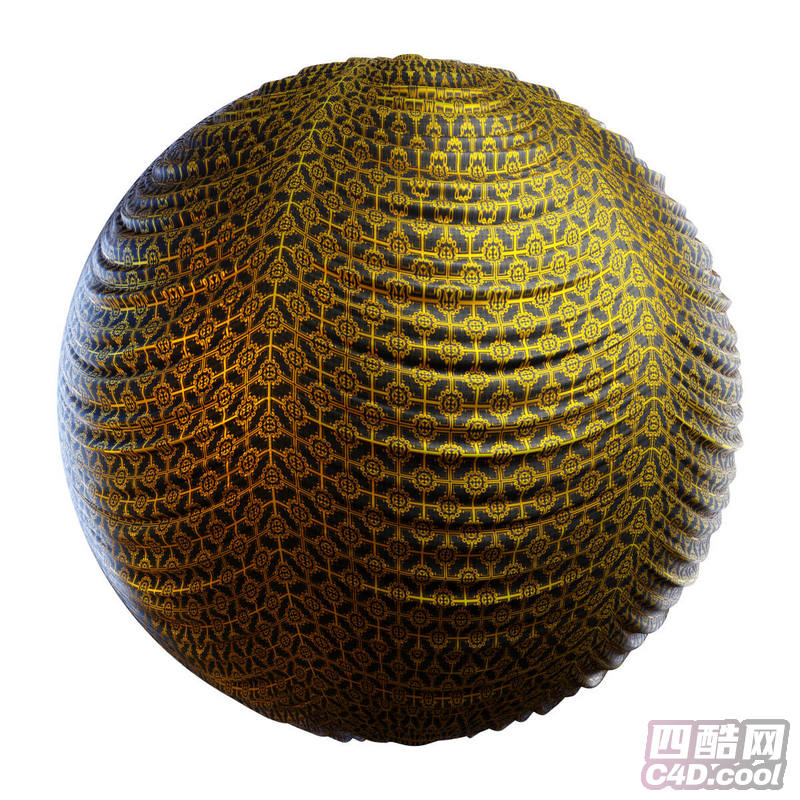 这是一套黑金褶皱窗帘 3D 纹理贴图,纹理以波浪形褶皱窗帘为基底,紧密包裹在球体表面,精准还原了布料在曲面上的自然垂坠与褶皱起伏效果。纹理主体为奢华的黑金配色,黑色底纹上布满精致的金色复古纹样,搭配细腻的布料褶皱肌理与哑光偏金属的光泽感,整体呈现出高贵典雅的宫廷质感,非常适合用于奢华家装、复古场景、影视道具、游戏场景等 3D 建模渲染。