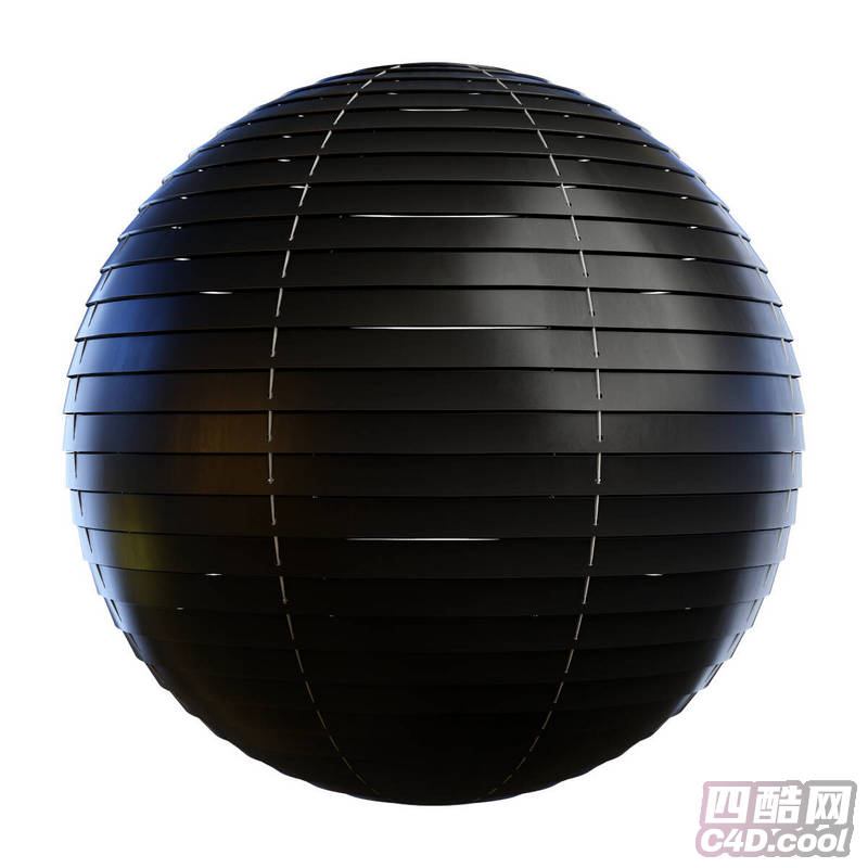 这是一套黑色金属百叶窗帘 3D 纹理贴图,纹理以水平排列的金属百叶叶片为基底,紧密包裹在球体表面,精准还原了百叶帘在曲面上的自然弧度与层叠结构。纹理主体为哑光黑色金属质感,叶片间由纤细的金属拉绳固定,表面带有细腻的金属反光与轻微的做旧磨损痕迹,整体呈现出冷峻利落的工业风与现代轻奢感,非常适合用于现代家装、办公空间、工业风场景、影视道具、游戏场景等 3D 建模渲染。