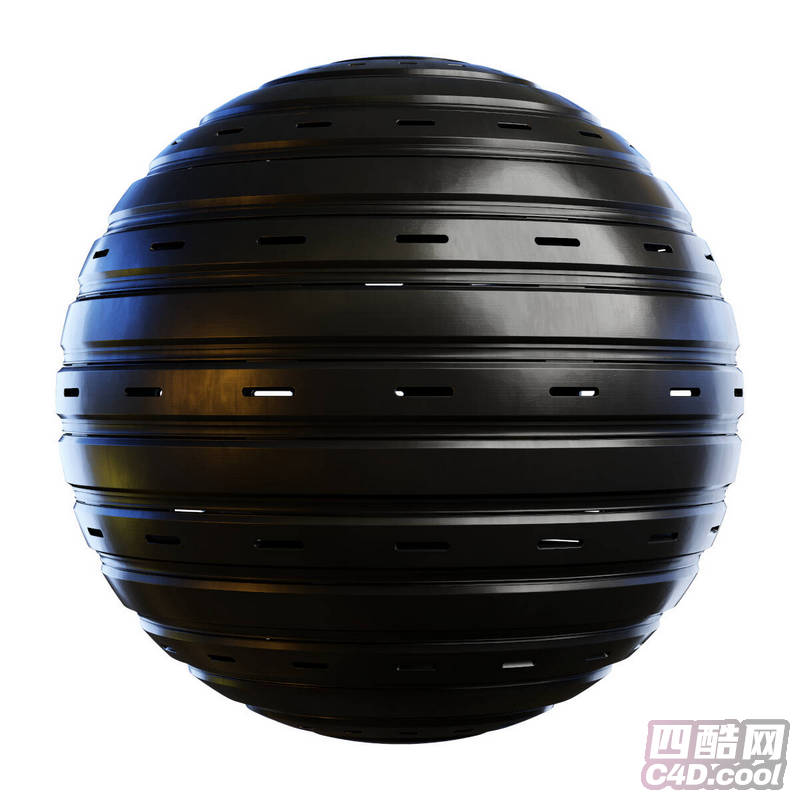 这是一套专为3D渲染设计的黑色窗户百叶窗纹理贴图,适用于Cinema 4D、Blender、Maya等主流三维软件,支持Octane、Redshift、Arnold、V-Ray等渲染器。贴图呈现真实金属质感,表面带有规则横向条纹与微小穿孔细节,模拟工业风或现代建筑中常见的卷帘门、遮阳百叶或装饰性金属帘结构。球体预览图中可见其在光照下呈现的金属高光与环境反射,边缘带有蓝色与金色环境光晕,体现物理准确的材质响应,适合用于近景特写或建筑可视化场景。
