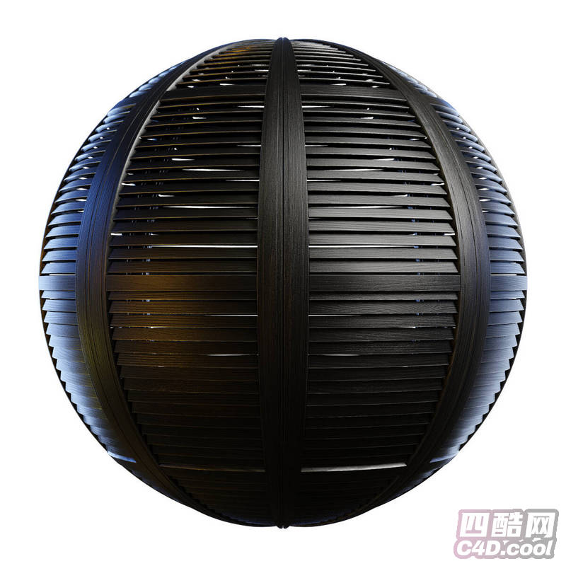 这是一套黑色木质窗户百叶窗 3D 纹理贴图,纹理以水平排列的实木百叶叶片为基底,由宽厚的竖向木带固定,紧密包裹在球体表面,精准还原了百叶窗在曲面上的自然弧度、层叠结构与木质肌理。纹理主体为深邃的黑棕色,表面带有细腻的实木木纹、温润的哑光质感与自然的光影反光,叶片间的缝隙营造出通透的光影效果,整体呈现出沉稳高级的现代轻奢与自然质感,非常适合用于现代家装、办公空间、原木风 / 工业风室内设计、影视道具、游戏场景等 3D 建模渲染。