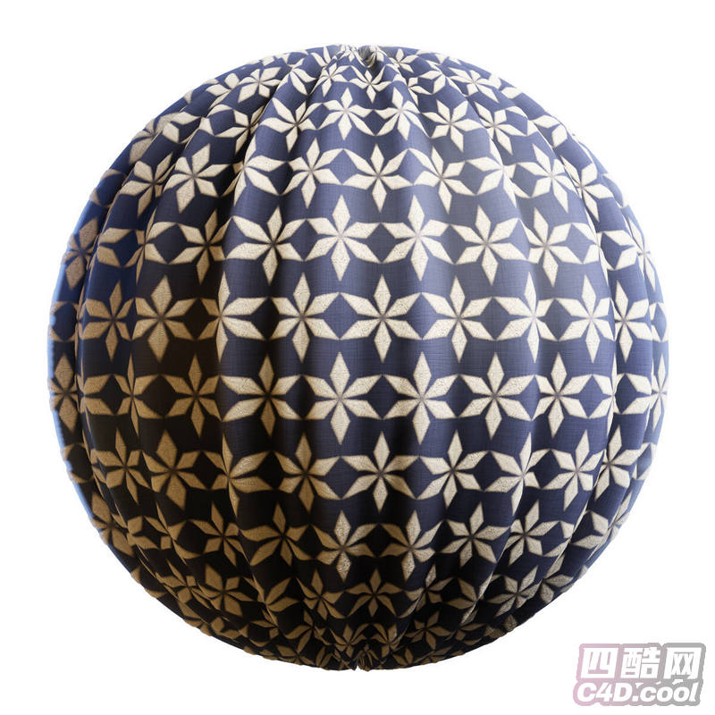 这是一套蓝色几何图案褶皱窗帘 3D 纹理贴图,纹理以竖向百褶布艺为基底,紧密包裹在球体表面,精准还原了窗帘在曲面上的自然垂坠、褶皱起伏与布料肌理。纹理主体为深邃的藏蓝色底,布满规整的米白色八芒星 / 麻叶状几何纹样,表面带有细腻的织物编织纹路与柔和的哑光光泽,褶皱的光影过渡自然,整体呈现出复古雅致的日式 / 中式传统风格,兼具柔软垂顺的布艺特性,非常适合用于日式家装、新中式软装、卧室 / 客厅场景、影视道具、游戏场景、建筑可视化等 3D 建模渲染。