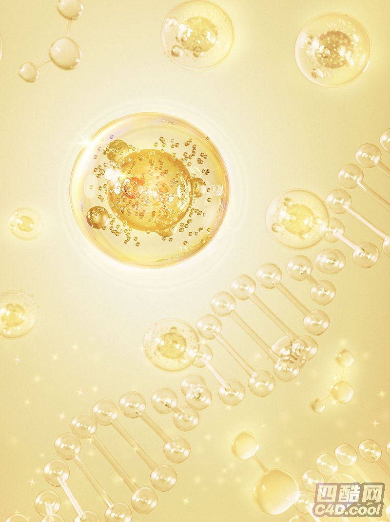 关键词覆盖:C4D工程、OC渲染、3D模型、细胞、微囊、DNA链、基因、分子结构、生物科技、医美、护肤、精华、抗老、修复、活性成分、黄金精华、透明球体、玻璃材质、折射光效、气泡、科技感、未来感、实验室、科研、化妆品广告、电商素材、高清渲染图、纳米科技、成分可视化、营养补充剂、抗衰老、细胞再生、渗透力、修护力、水油融合、高端护肤、奢华质感。
